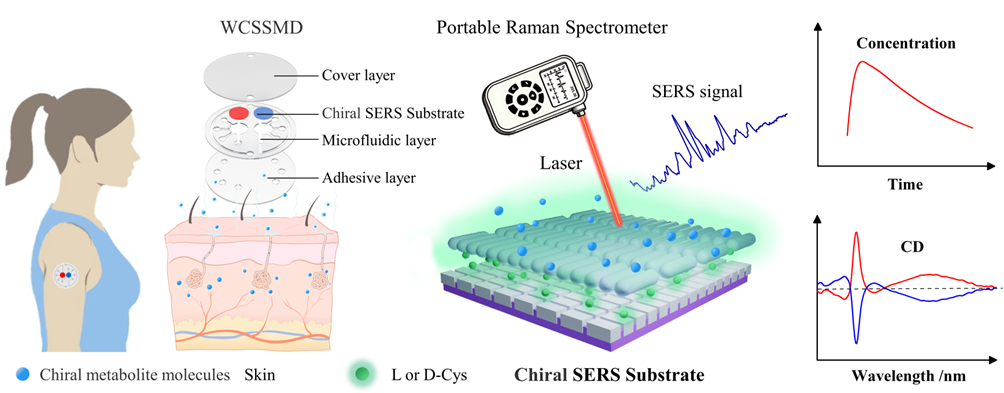 圖1.?可穿戴手性SERS微流控傳感技術實現(xiàn)人體汗液中手性代謝分子的實時監(jiān)測