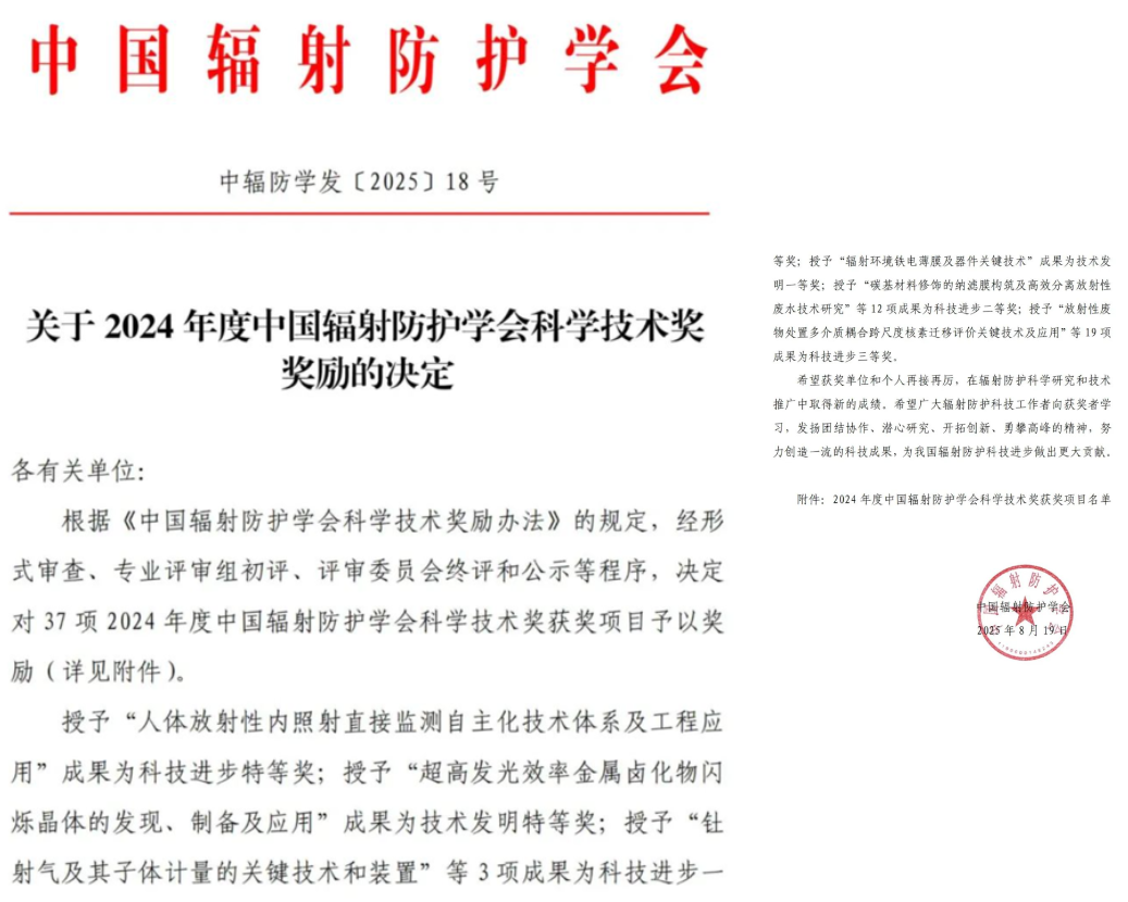 8月19日,中國輻射防護學會公布《關于2024年度中國輻射防護學會科學技術獎獎勵的決定》。中國科學院上海硅酸鹽研究所作為第一完成單位,由上海硅酸鹽所吳云濤研究員牽頭完成的“超高發(fā)光效率金屬鹵化物閃爍晶體的發(fā)現(xiàn)、制備與應用”項目榮獲中國輻射防護學會技術發(fā)明特等獎,項目參與單位包括北京師范大學、華中科技大學、西北核技術研究所和中國科學院高能物理研究所。