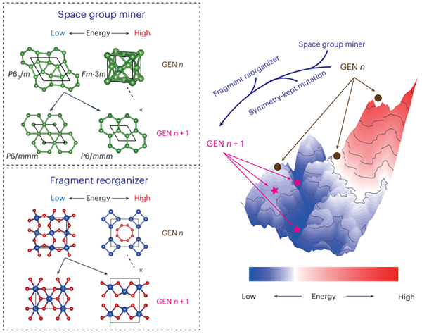 孫建教授領(lǐng)導(dǎo)的研究團(tuán)隊基于晶體結(jié)構(gòu)中廣泛存在的對稱性原理,設(shè)計了一種晶體結(jié)構(gòu)預(yù)測新方案。該方案進(jìn)一步升級了該課題組先前提出的機(jī)器學(xué)習(xí)與圖論輔助的晶體結(jié)構(gòu)預(yù)測框架MAGUS軟件(machine learning and graph theory assisted universal structure searcher, National Science Review 10, nwad128 (2023)),在晶體結(jié)構(gòu)搜索過程中更加強(qiáng)調(diào)對空間群對稱性的偏好,避免對P1結(jié)構(gòu)空間的探索,引入了保持對稱性的進(jìn)化算符來避免生成P1結(jié)構(gòu)。另外,根據(jù)晶體結(jié)構(gòu)間的超群-子群關(guān)系,研究團(tuán)隊使用空間群挖掘器取代隨機(jī)選擇某一空間群的采樣方式,通過分析具有能量優(yōu)勢的結(jié)構(gòu)的對稱性,在進(jìn)化算法的新一代結(jié)構(gòu)中優(yōu)先采樣其相同的空間群和他們的超群。為了保護(hù)能量有利的原子環(huán)境,研究團(tuán)隊發(fā)展了片段重組器,暨使用圖論分解能量有利的晶體結(jié)構(gòu),然后將分解得到的原子聚集體片段重組為新結(jié)構(gòu)。