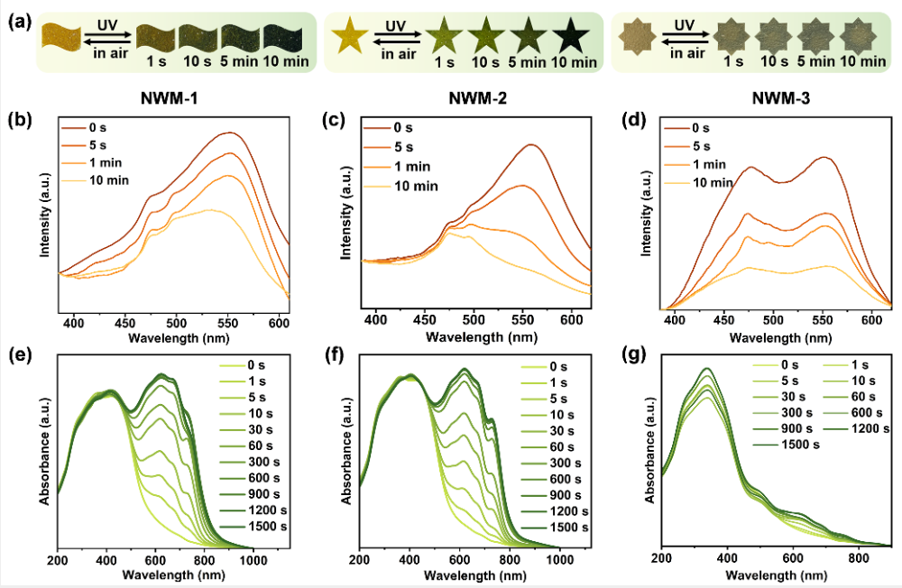 圖1. TCPE4-/紫精分子的特性;在365 nm紫外光照射下NWM-1-3由黃到綠的可逆光致變色。