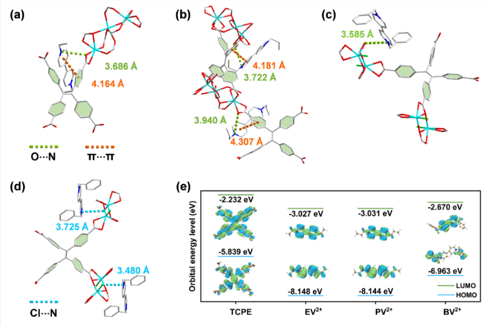 圖2. (a-d) NWM-1-3的電子轉(zhuǎn)移路徑,紫精吡啶環(huán)與TCPE4-苯環(huán)的π?π相互作用;(e) H4TCPE和紫精分子的HOMO和LUMO軌道分布。