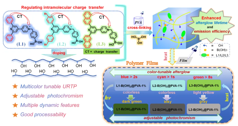 結(jié)合多種光譜分析表明,這類多功能吡啶鎓單元受光激發(fā),誘導(dǎo)ICT驅(qū)動的電荷分離,可形成具有不同能量的長壽命三線態(tài)電荷轉(zhuǎn)移(CT)態(tài),從而可實現(xiàn)多色長壽命室溫磷光發(fā)射。PVA基質(zhì)不僅穩(wěn)定了這些三線態(tài)CT態(tài),還促進(jìn)了CT介導(dǎo)的從羥基到吡啶鎓受體的電子轉(zhuǎn)移,產(chǎn)生具有可逆光致變色行為的穩(wěn)定自由基。此外,通過硼酸交聯(lián)吡啶鎓摻雜的PVA網(wǎng)絡(luò),所構(gòu)筑的聚合物體系在保持高對比度可逆光致變色行為的同時,將磷光壽命(提升至0.96秒)與量子效率(提高至27.8%)明顯提升。