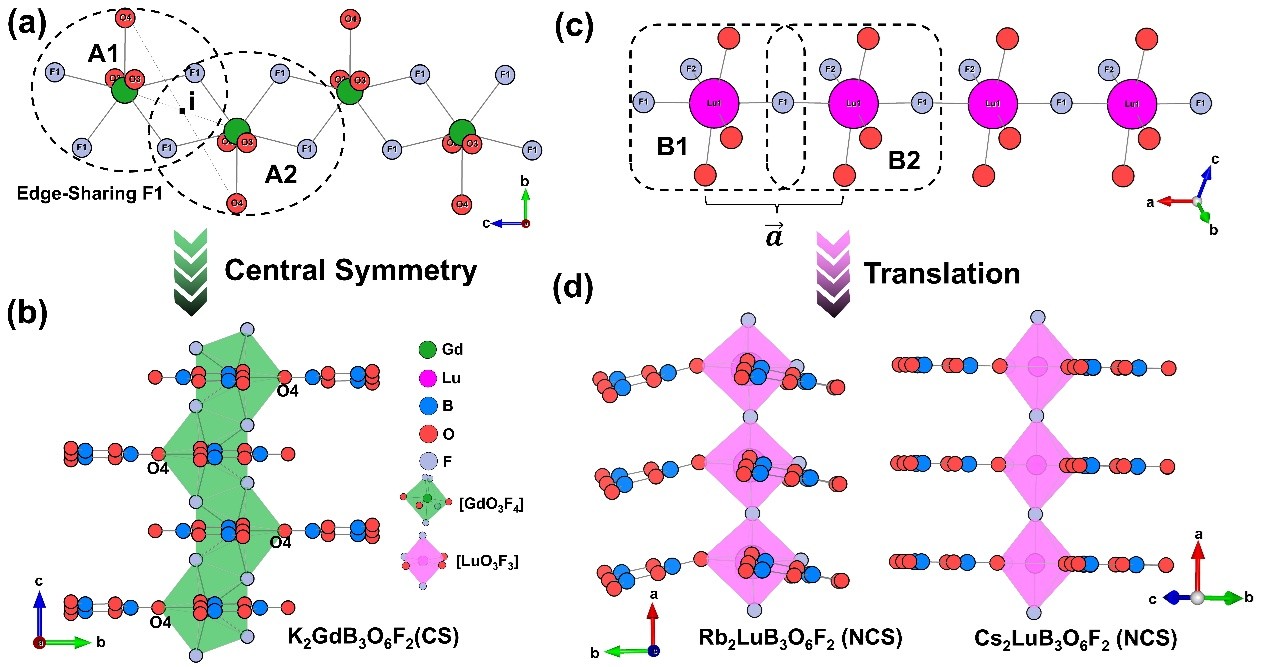 中國科學院新疆理化技術(shù)研究所潘世烈和楊云研究員研究團隊成功合成了三種新型稀土金屬硼酸鹽氟化物,K2GdB3O6F2、Rb2LuB3O6F2和Cs2LuB3O6F2。實驗表明三個標題化合物都表現(xiàn)出小于200 nm的短截止邊,其中Cs2LuB3O6F2表現(xiàn)出1.5×KH2PO4的實驗倍頻效應。計算顯示Rb2LuB3O6F2和Cs2LuB3O6F2的I類最短相位匹配波長分別為210和202 nm,這說明它們有潛力通過Nd:YAG激光器的五次諧波產(chǎn)生過程直接輸出213 nm的相干光。更重要的是,從中心對稱的K2GdB3O6F2到非中心對稱的Rb2LuB3O6F2和Cs2LuB3O6F2的結(jié)構(gòu)演化表明,稀土金屬多面體配位影響了[B3O6]基團的排列和取向,對結(jié)構(gòu)最終的對稱性起著決定性作用。