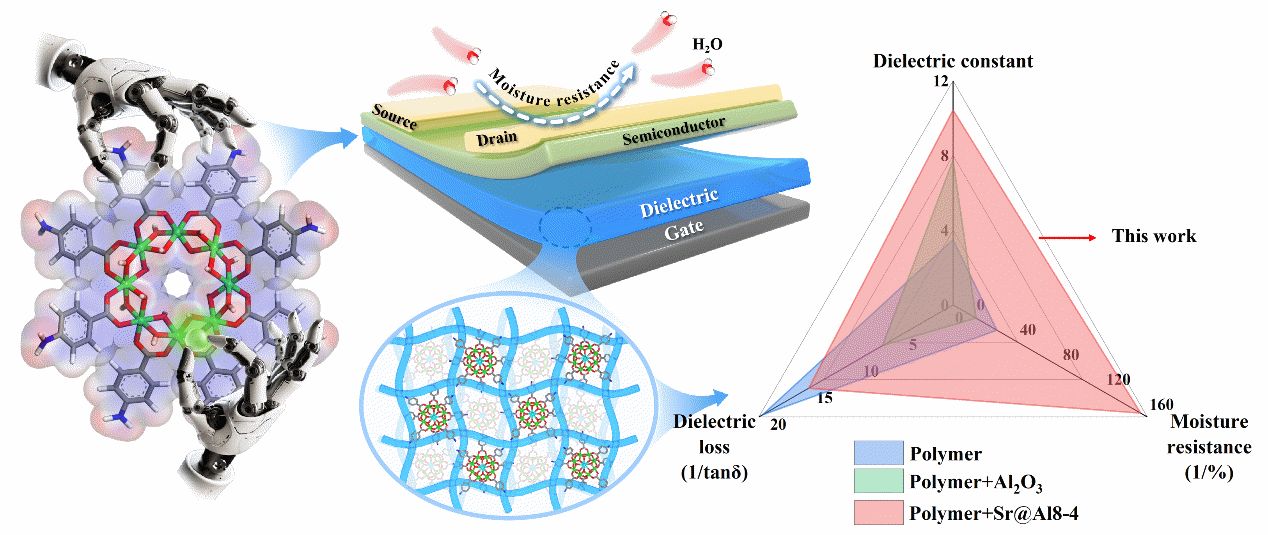 科研進(jìn)展場(chǎng)效應(yīng)晶體管作為微電子技術(shù)的核心,在電子器件領(lǐng)域具有廣泛的應(yīng)用前景。構(gòu)建具有高介電常數(shù)、低介電損耗和良好環(huán)境穩(wěn)定性的聚合物復(fù)合介電材料對(duì)于提升場(chǎng)效應(yīng)晶體管的性能和可靠性至關(guān)重要。然而,傳統(tǒng)的高介電常數(shù)摻雜材料如Al2O3、TiO2和高極性聚合物等,仍然存在界面粗糙、易團(tuán)聚、兼容性不足、損耗高和濕度敏感等問題。由此產(chǎn)生的器件吸濕效應(yīng)不僅會(huì)導(dǎo)致介電性能不穩(wěn)定,而且阻礙了聚合物復(fù)合界面上載流子運(yùn)輸機(jī)制的理論研究。