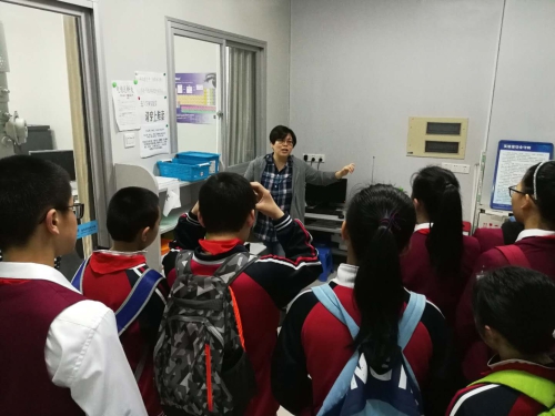 在納米樓一樓報告廳,陳蓮研究員事先準備好了兩瓶看似一樣無色的水、四瓶白色粉末以及三張藏有玄妙的白色A4紙,她用提問啟發(fā)和實驗觀察的方式將孩子們帶入本次科普講座的主題《不可見的光》。一支簡單的紫外光筆就能讓隱藏在表面現(xiàn)象背后的真實世界顯現(xiàn),陳蓮研究員用通俗易懂、詼諧幽默的語言從天空中的彩虹開始介紹光譜的基本知識以及科學家們發(fā)現(xiàn)紫外光、紅外光的過程,還將科學知識拓展到人類對紫外光的應用和防護,給孩子們上了一堂生動有趣的科普課。為了加深孩子們對光譜知識的理解,在參觀實驗室環(huán)節(jié),測試中心的工作人員利用簡單的實驗儀器為孩子們做了簡單的小實驗,再次為孩子們普及了光譜的基本常識。在透射電鏡實驗室、開放實驗室,工作人員和正在做實驗的研究生們也詳細為孩子們介紹了他們正在做的工作,回答孩子們提出的問題。