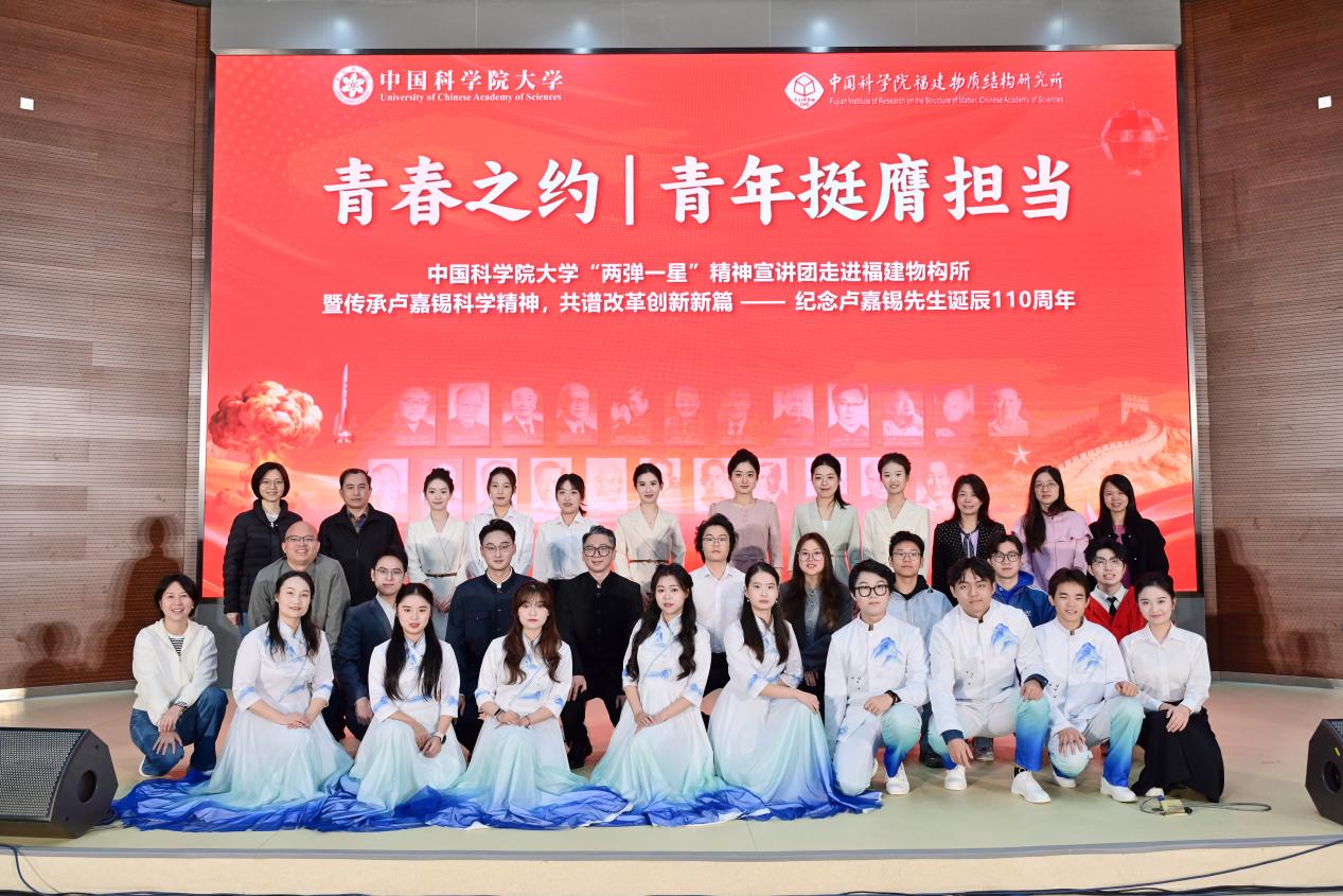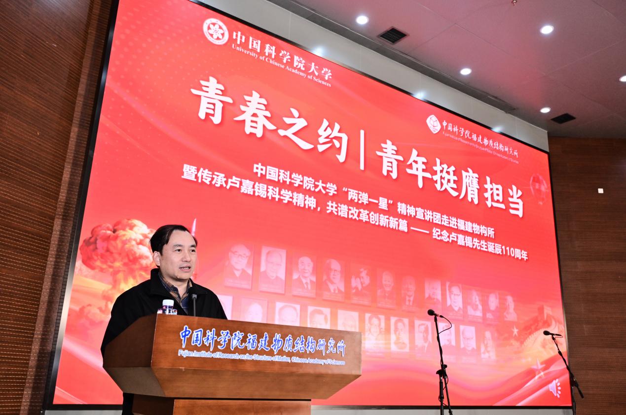 頭條新聞11月21日,中國(guó)科學(xué)院大學(xué)(以下簡(jiǎn)稱“國(guó)科大”)“兩彈一星”宣講團(tuán)走進(jìn)中國(guó)科學(xué)院福建物質(zhì)結(jié)構(gòu)研究所(以下簡(jiǎn)稱“福建物構(gòu)所”),開(kāi)展了一場(chǎng)別開(kāi)生面的“青春之約”專題宣講。本次活動(dòng)由國(guó)科大團(tuán)委、福建物構(gòu)所教育處、研究生會(huì)共同主辦,所黨委書(shū)記、副所長(zhǎng)張健,國(guó)科大團(tuán)委書(shū)記陳睿,教育處人員及300余名師生代表出席活動(dòng),共同見(jiàn)證這場(chǎng)青春之約,以青春對(duì)話信仰,共同打造“科教融合”思政大課堂。