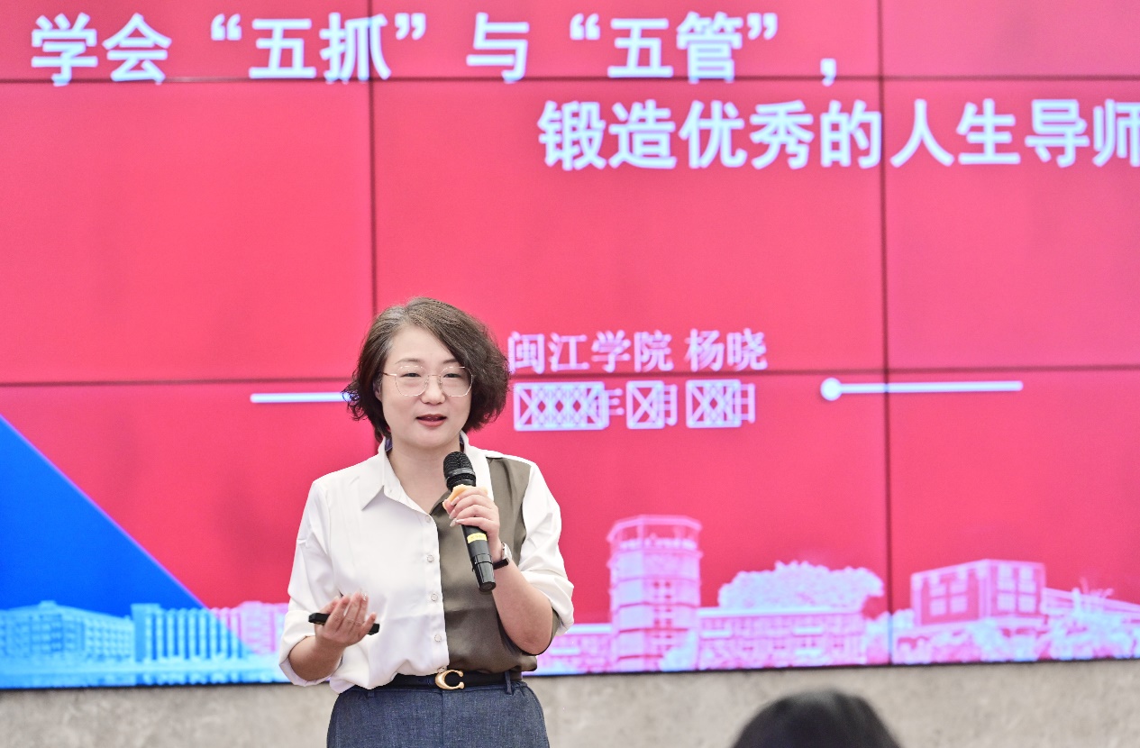 聘任儀式后,楊曉以《學會“五抓”與“五管”,鍛造優(yōu)秀的人生導師》為題,帶來首場專題培訓。她從輔導員工作的時代性、發(fā)展性、重要性切入,提出要凝聚思政引領力、擦亮輔導員“三原色”,并圍繞“五抓”與“五管”核心方法,結合高校育人實例,為輔導員詳解如何用心用情做好學生工作,清晰解答了“做什么”“怎么管”的關鍵問題。