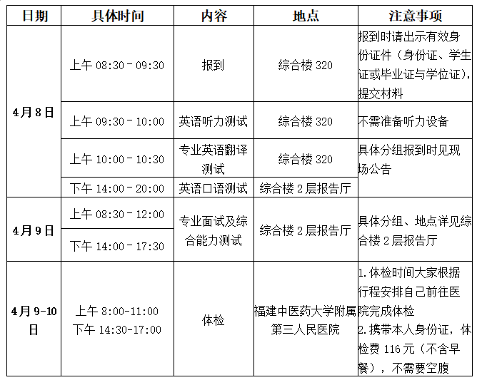(1)時間:4月9日-10日上班時間(上午8:00-11:00,下午14:30-17:00),大家根據(jù)行程安排自己前往醫(yī)院完成體檢。